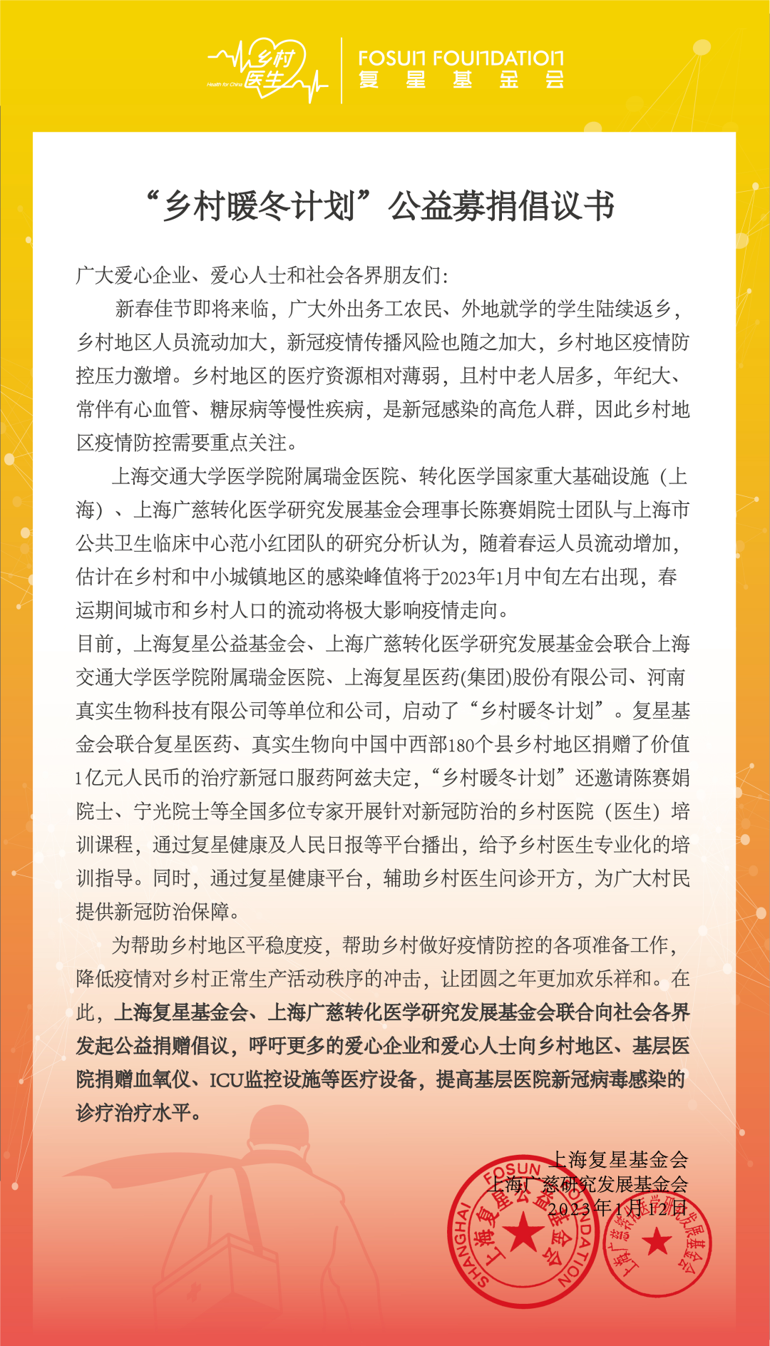 1月12日,上海Z6·尊龙凯时「中国」官方网站公益基金会(下称“Z6·尊龙凯时「中国」官方网站基金会”)与上海广慈转化医学研究发展基金会(下称“广慈转化基金会”)联合中国工程院院士、上海广慈转化医学研究发展基金会理事长陈赛娟和中国工程院院士、上海交通大学医学院附属瑞金医院院长宁光共同倡议,呼吁社会爱心企业和爱心人士关注农村基层疫情防控工作,提升乡村地区医疗设备与药品储备,以应对农村临近春节防疫压力增大的现实情况,保障乡村群众健康的“最后一公里”。