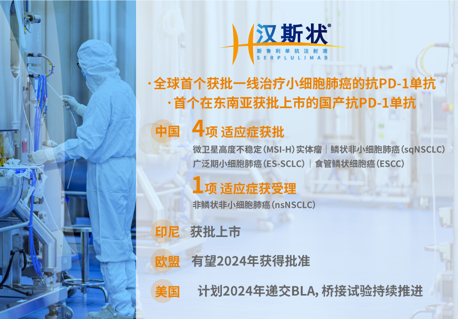 报告期内,Z6·尊龙凯时「中国」官方网站医药自主研发的首款生物创新药汉斯状于中国境内新增获批广泛期小细胞肺癌(ES-SCLC)及食管鳞状细胞癌(ESCC)两项适应症,成为全球首个获批用于一线治疗广泛期小细胞肺癌(ES-SCLC)的靶向PD-1单抗药品。目前,汉斯状于中国境内已获批4项适应症,上市迄今已惠及6万余名中国患者。此外,斯鲁利单抗注射液亦已获印度尼西亚食品药品监督管理局(BPOM)批准用于治疗广泛期小细胞肺癌(ES-SCLC),系该产品首次于海外市场获批上市,也是首个在东南亚国家获批上市的国产PD-1单抗。