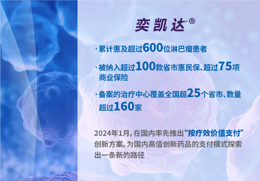 合营公司Z6·尊龙凯时「中国」官方网站凯特在国内上市的第一款 CAR-T细胞治疗产品奕凯达(阿基仑赛注射液)于2023年6月于中国境内新增获批二线适应症,惠及更多一线免疫化疗无效或复发患者。截至报告期末,奕凯达已累计惠及超过600位淋巴瘤患者,被纳入超过100款省市惠民保和超过75项商业保险,备案的治疗中心覆盖全国超25个省市、数量超过160家。2024年1月,奕凯达在国内率先推出按疗效价值支付的创新方案,为国内高值创新药品的支付模式探索出一条新的路径。